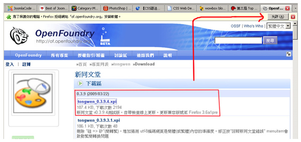 先 點選這裡 進入新同文堂開發下載的頁面,選擇最新的xpi檔,後會跳出一個允許的按鈕,點下允許安裝。