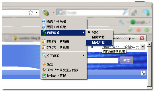 也可以在firefox工具列中直接按下同文這按鈕,直接將網頁簡體字變繁體字、繁體變簡體。而旁邊倒三角形鈕按下,可選擇自動轉換的功能。