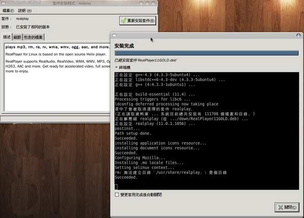 之後直接在下載下來的檔案RealPlayer11GOLD.deb上點兩下,會出現一個安裝的對話框,按下安裝套件。